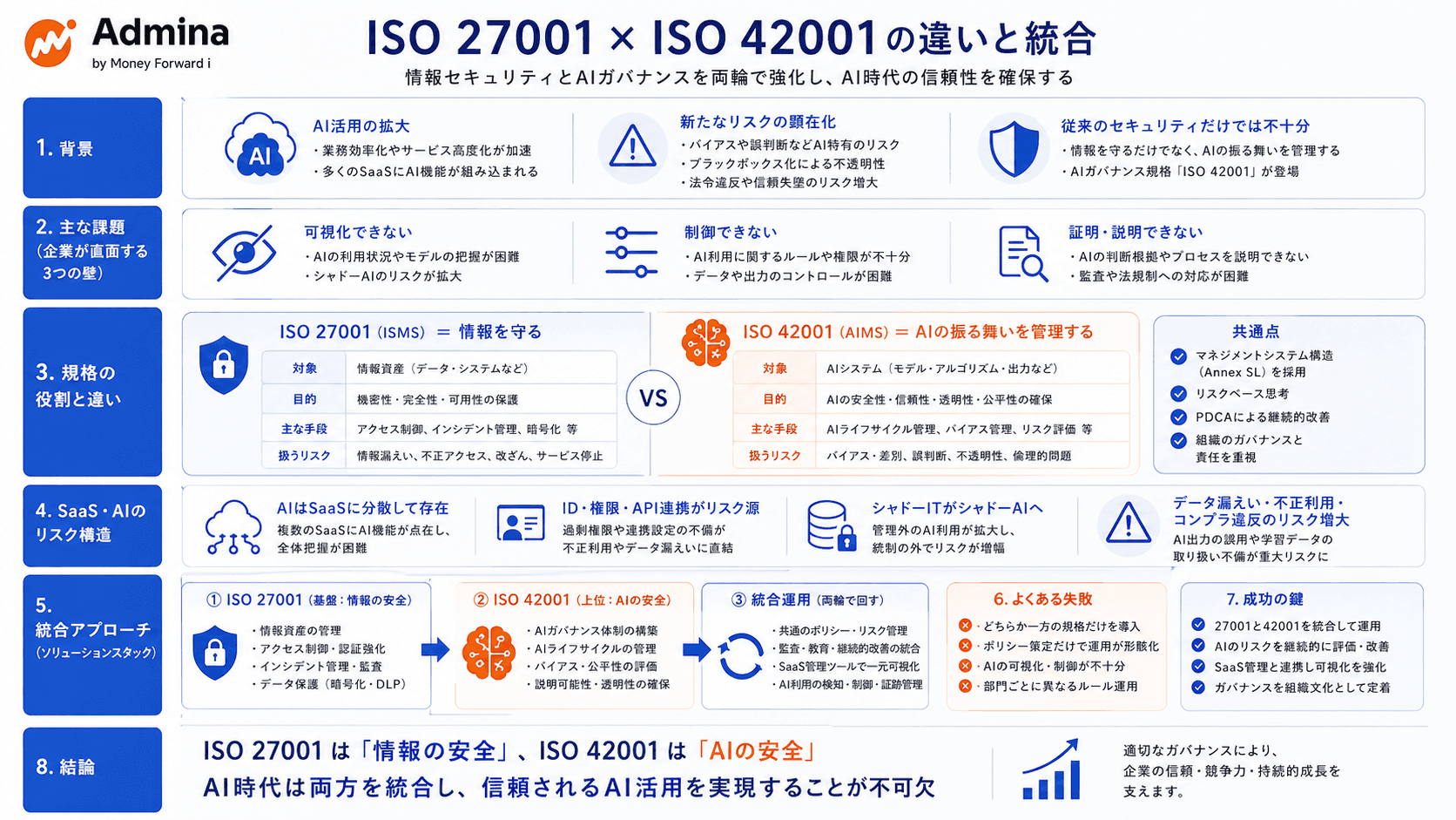 ISO 27001は「情報の機密性・完全性・可用性」を守る防御的基盤であり、ISO 42001は「AIの倫理・透明性・公平性」を担保する社会的説明責任の枠組みと言えます。