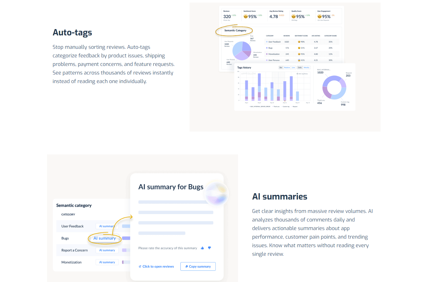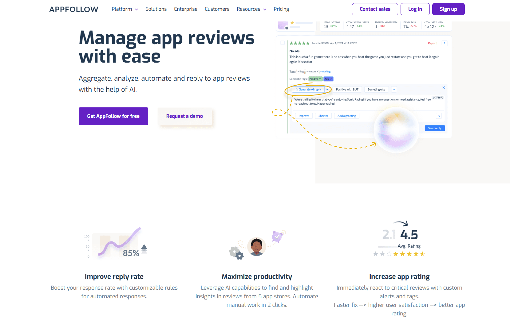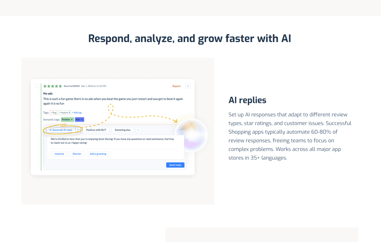 AppFollowは、モバイルアプリの運用・成長を支援する統合プラットフォームです。複数のアプリストア(App Store・Google Play など)からユーザーレビューや評価、ランキングデータを一元的に集約し、AIによる感情分析・タグ付けや自動応答機能でレビュー管理を効率化できます。また、キーワード分析や競合分析を通じてアプリストア最適化(ASO)を促進し、アプリの可視性向上やダウンロード増加につなげられるのが特徴です。リアルタイムのパフォーマンスモニタリングやカスタムレポート、Slack・Zendeskなど多数の外部ツールとの連携によって、マーケティング・プロダクト・サポートチームの連携も強化されます。企業規模を問わず利用され、ユーザー満足度の向上とアプリ評価の最適化を支援するサービスです。