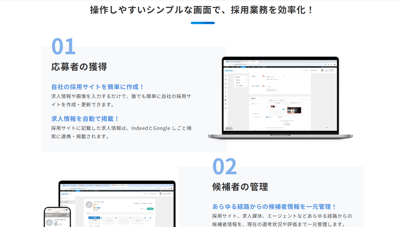 応募者の獲得から候補者の管理、選考の実施、採用分析まで、採用業務全体をひとつのシステムで一元管理できます。自社採用サイトの作成・更新が簡単に行えるほか、IndeedやGoogleしごと検索への自動掲載にも対応。複数の求人媒体やエージェントからの候補者情報をまとめて管理し、LINEを使った候補者とのやり取りやカレンダー連携による面接日程調整も可能です。