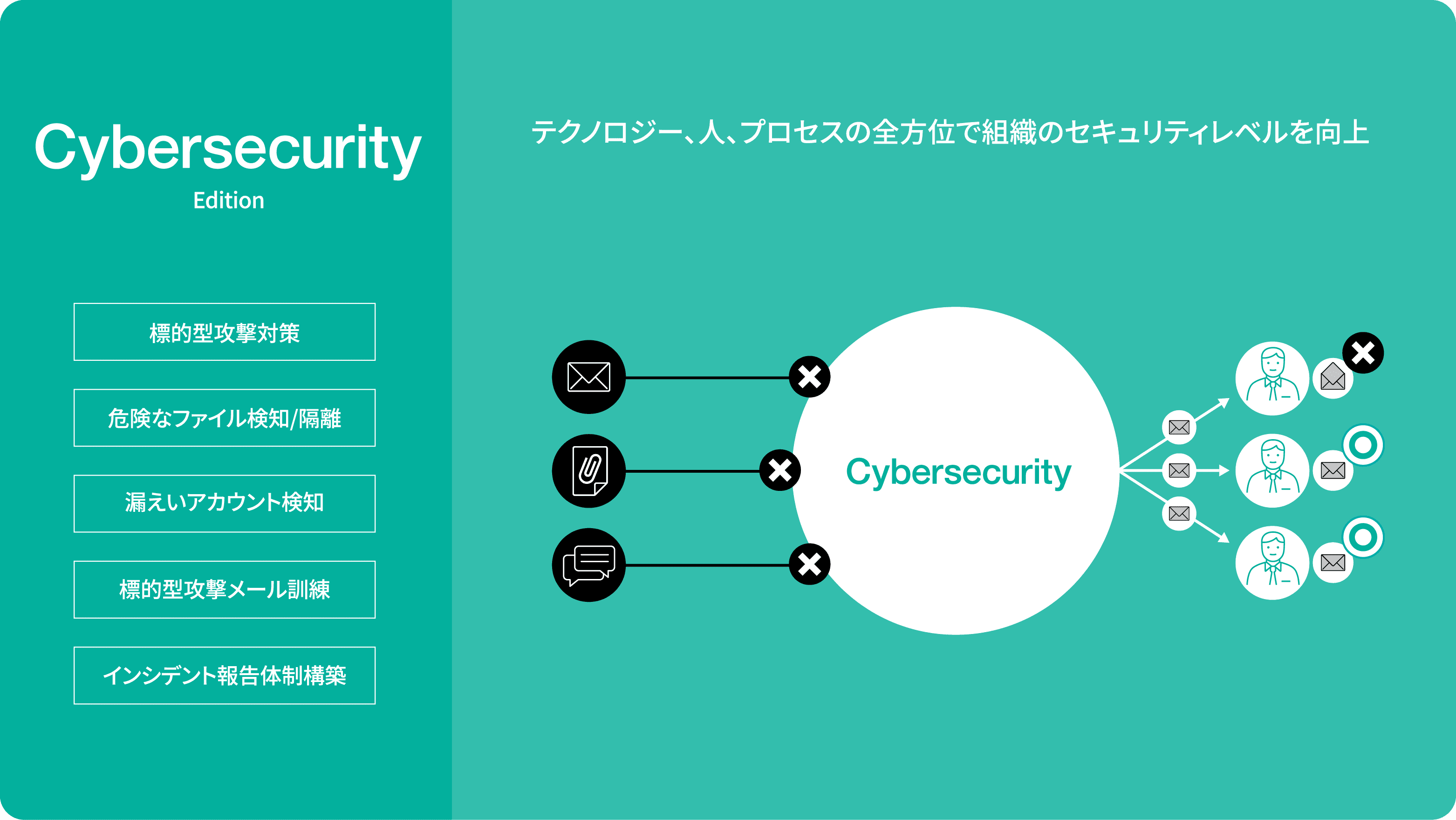 HENNGE Oneでは3つのEditionを提供し、これらの課題を解決します。複数のシステムIDをまとめて保護し、効率的な働き方を実現する「Identity Edition」、組織に散在するデータの意図せぬ漏えいを防ぐ「DLP Edition」、人、プロセス、デバイスの全方位でサイバー攻撃から守る「Cybersecurity Edition」です。