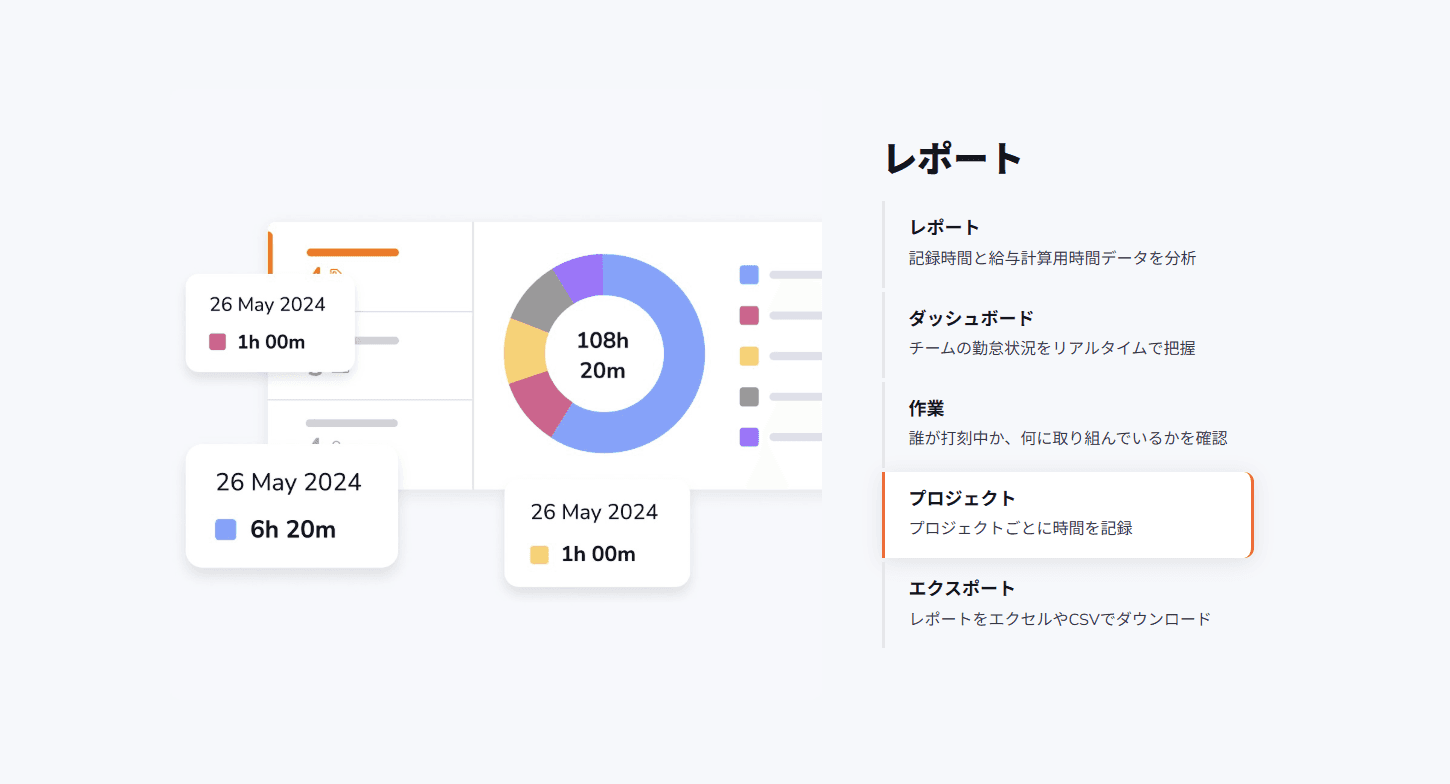 PCやスマートフォンから打刻が可能で、リアルタイムに出退勤状況や作業内容を把握できます。GPSや顔認証などの機能により不正打刻を防止し、リモートワークや現場業務にも対応します。また、自動でタイムシートを作成し、給与計算や請求業務と連携できるため、管理業務の効率化にも貢献します。さらに、レポート機能により労働時間や生産性を可視化し、チーム全体のパフォーマンス向上を支援します。