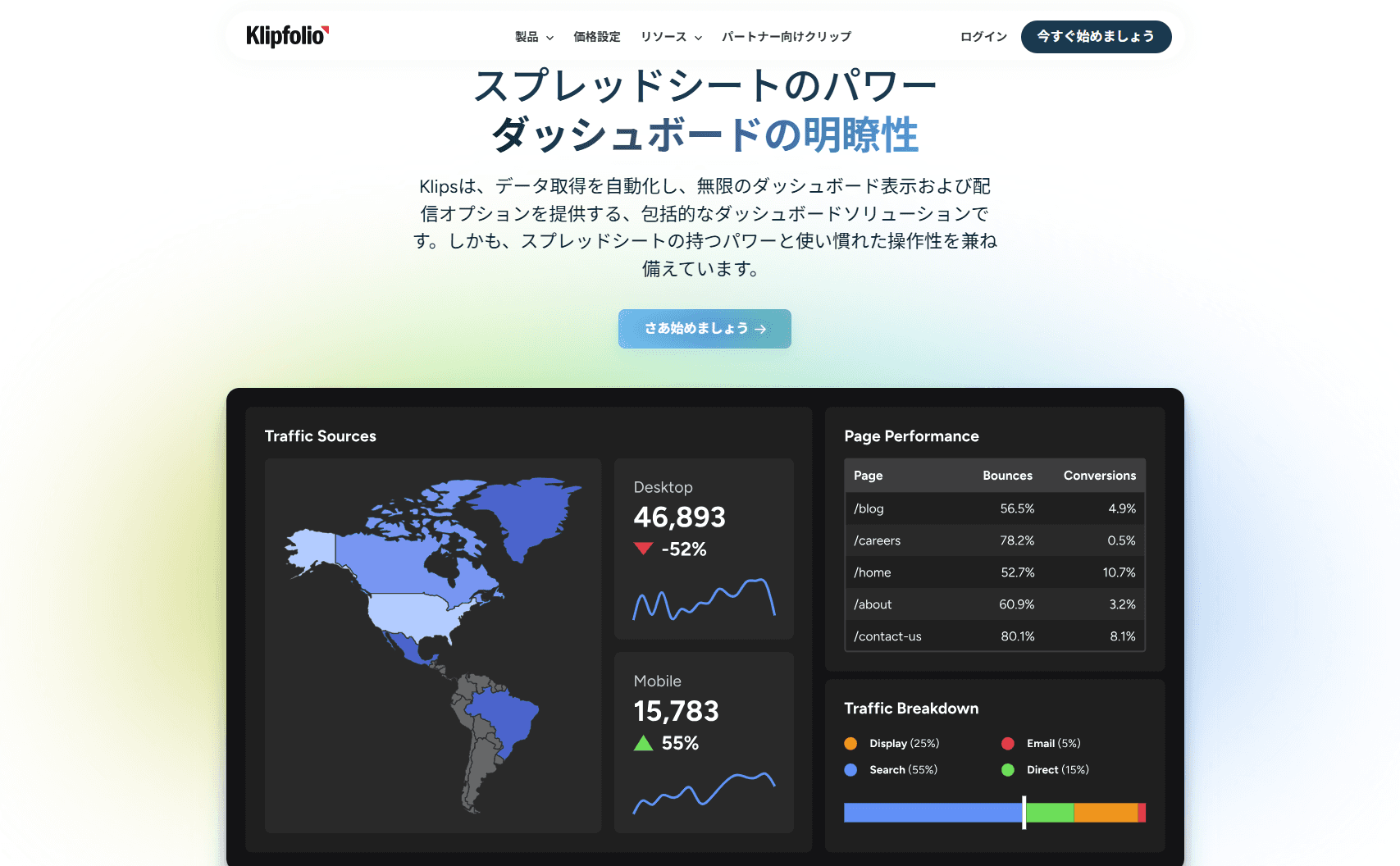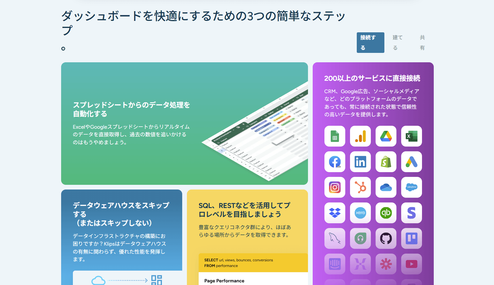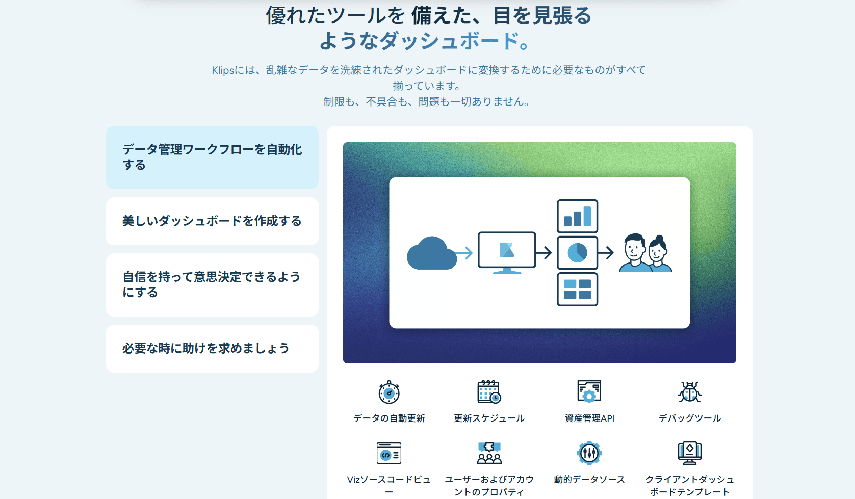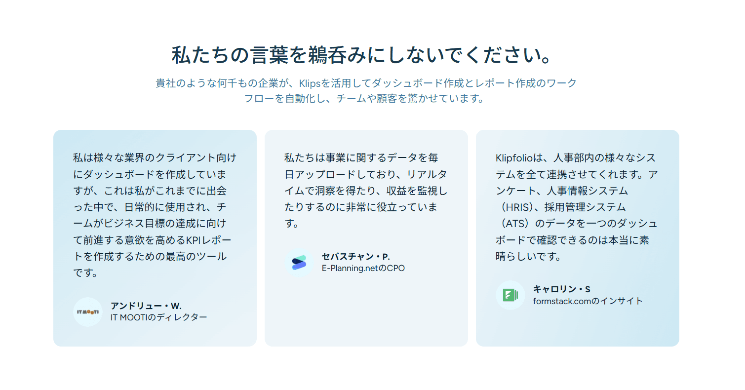 Klipfolioは、企業内外のさまざまなデータを統合し、リアルタイムで可視化・分析できるクラウド型のBIツールです。
