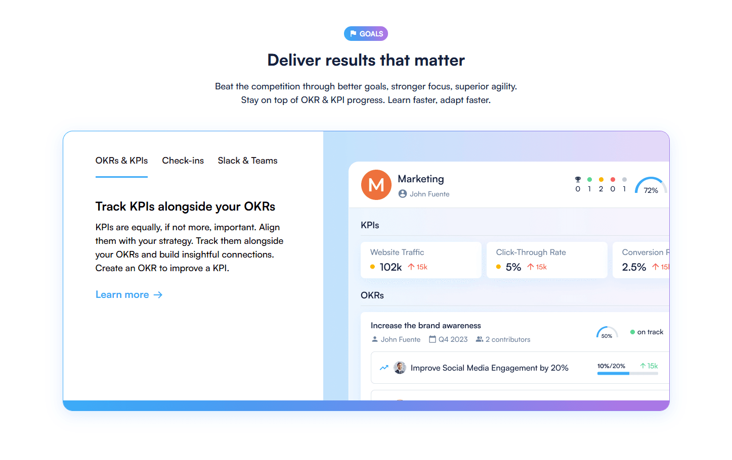 Perdooは、企業の戦略実行を支援するOKR・戦略管理プラットフォームです。戦略を可視化し、組織全体のOKRとKPIを紐づけて追跡することで、チームのフォーカスと協調を高め、成果につなげます。目標の進捗はリアルタイムで更新でき、定期的な進捗共有やチェックインによって透明性と責任感を強化します。