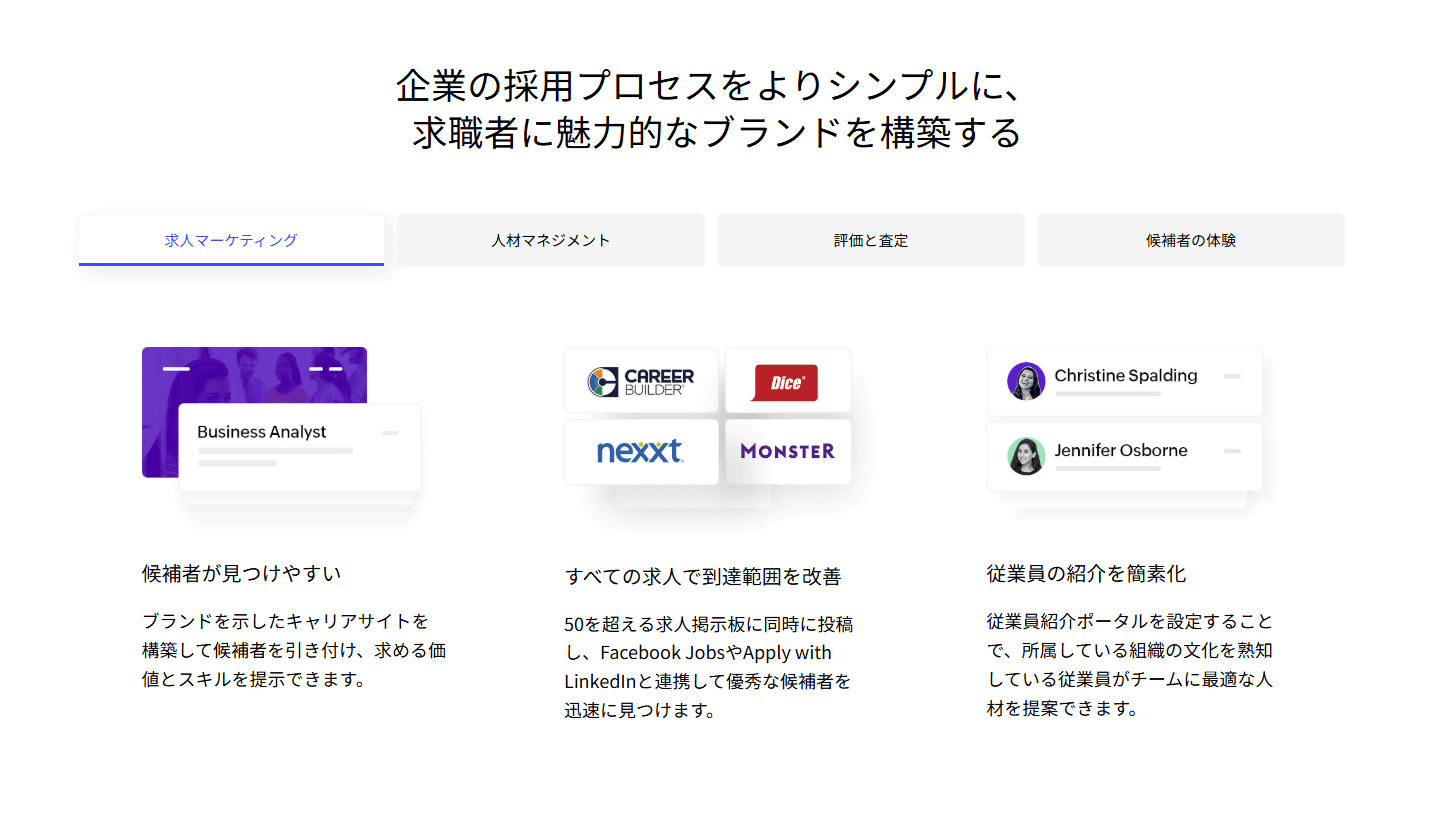 求人票の一括投稿から候補者の追跡、面接調整、入社手続きまで、採用プロセス全体を一つのプラットフォームで一元管理できます。75以上の求人掲示板への同時投稿や、繰り返し作業の自動化により、採用担当者の業務負担を大幅に削減します。50以上の外部ツールとの連携にも対応しており、既存の業務環境に合わせて柔軟に導入できます。モバイルアプリも提供されているため、場所を問わず採用活動を進めることが可能です。