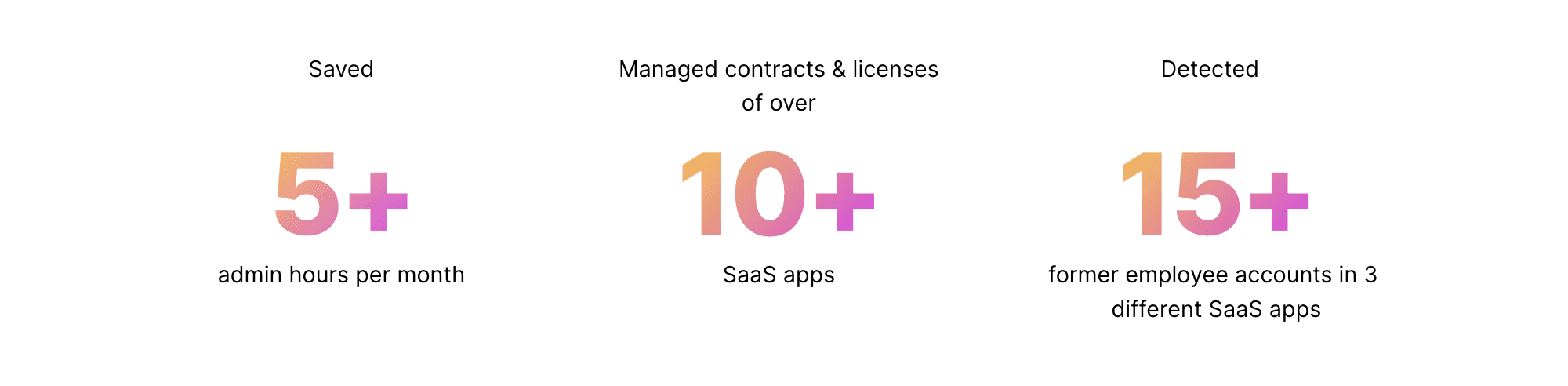In terms of de-provisioning, Admina made it easy to track and de-provision SaaS accounts for contract employees in a timely manner, improving efficiency and control. They detected over 15 former employee accounts in 3 different SaaS apps, and were able to take necessary action right away, helping them save over 5+ admin hours per month.